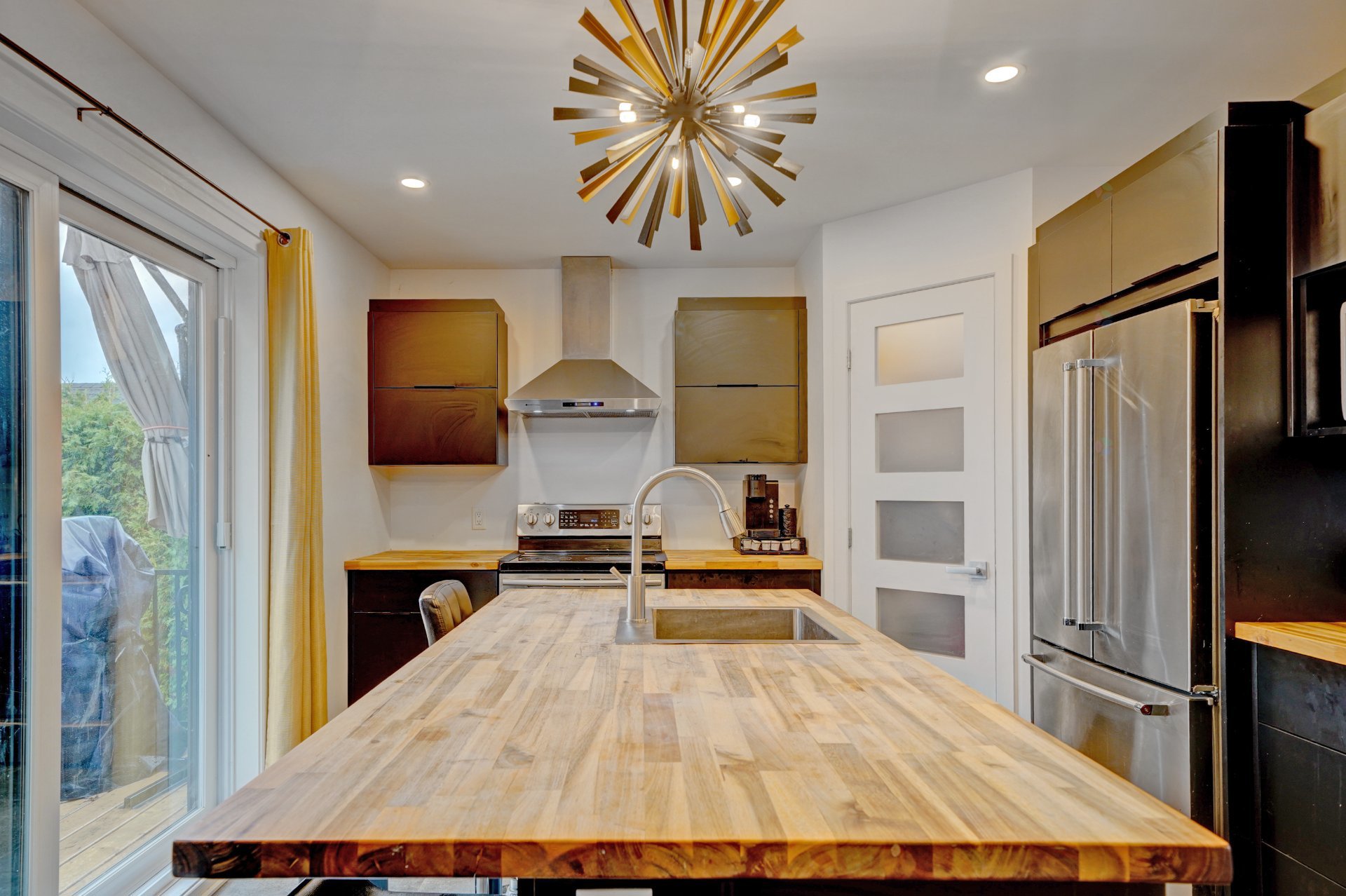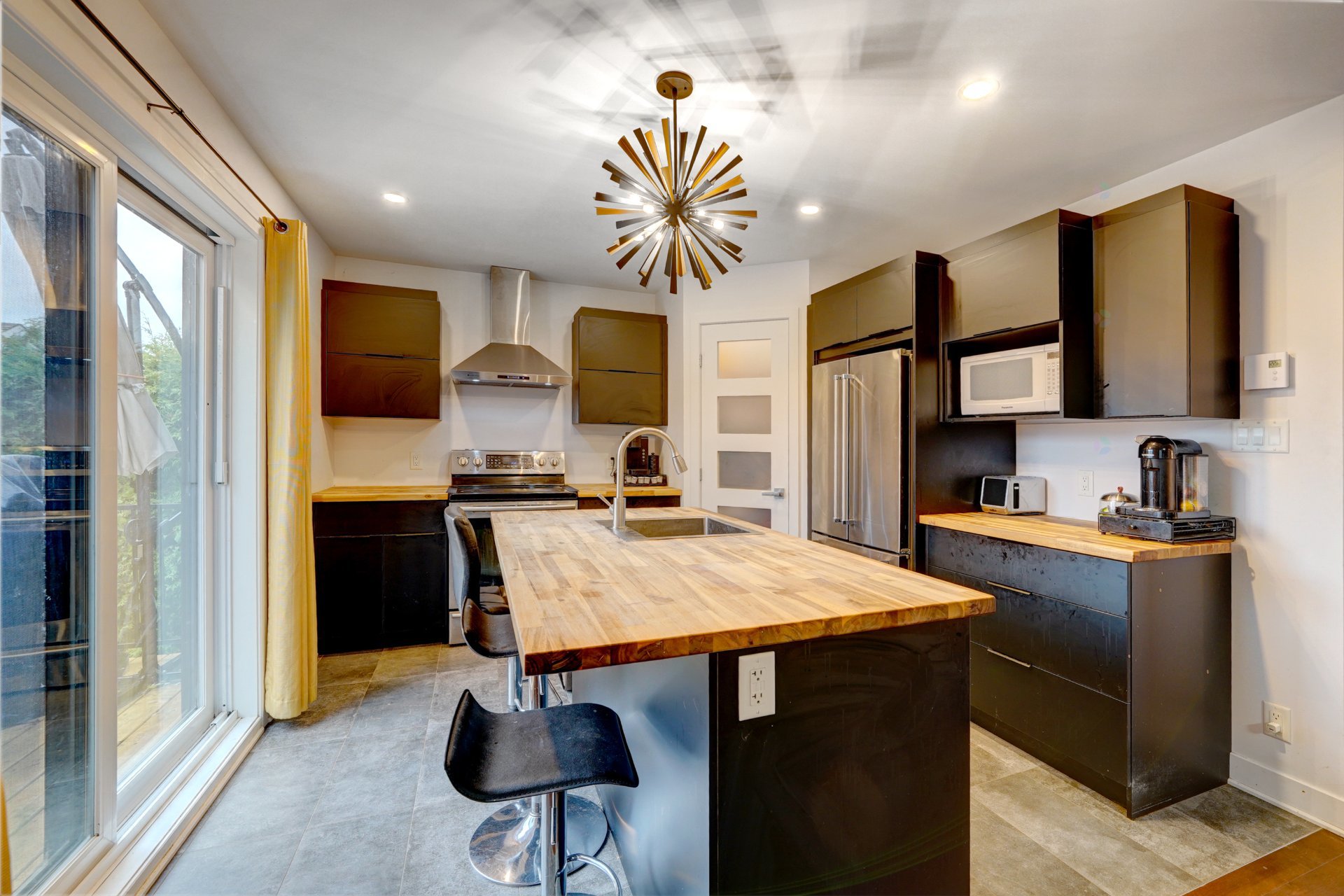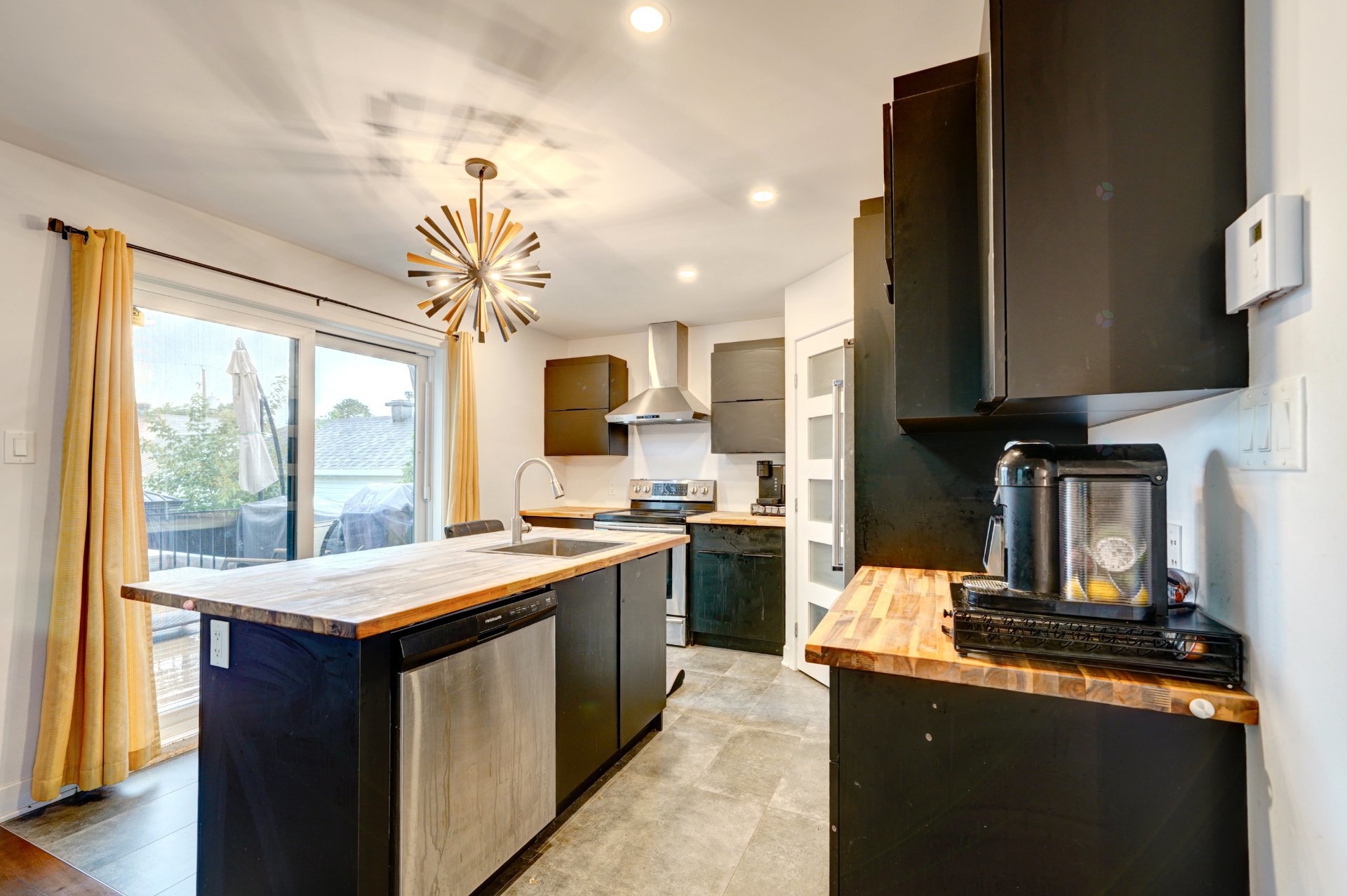 Luminaires, tringles, stores, rideaux, lave-vaisselle, thermopompes murales, porte-manteau, système d'alarme, tabourets (3), cabanon, gazebo, 2 parasols.
