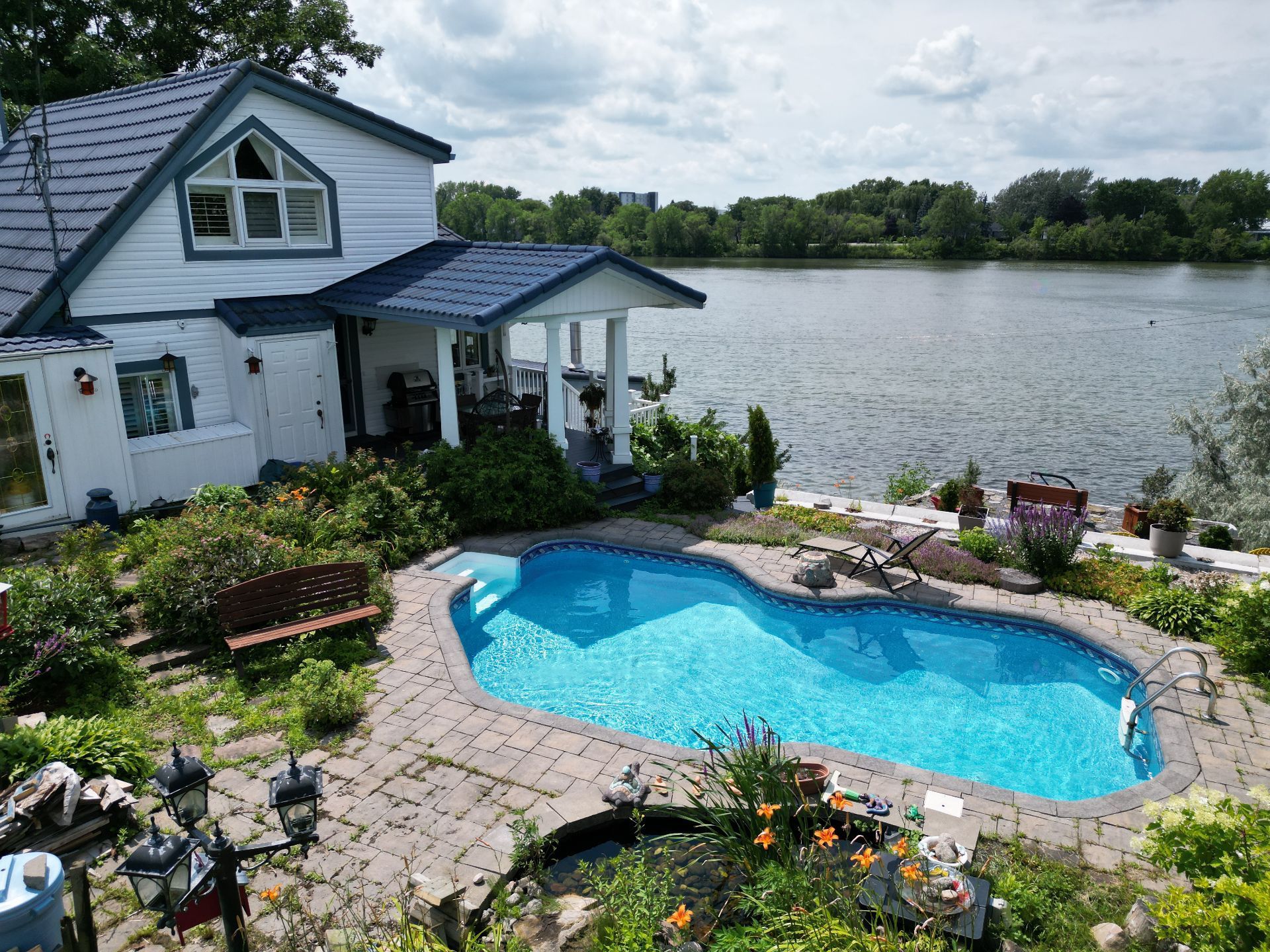 La grande terrasse couverte est l'endroit parfait pour profiter d'une vue panoramique époustouflante sur la rivière richelieu. En contrebas, un espace aménagé pour des feux de soirée offre des moments inoubliables au coucher du soleil. La piscine creusée, située en retrait de la rive, garantit une intimité totale tout en offrant une vue imprenable sur l'eau.