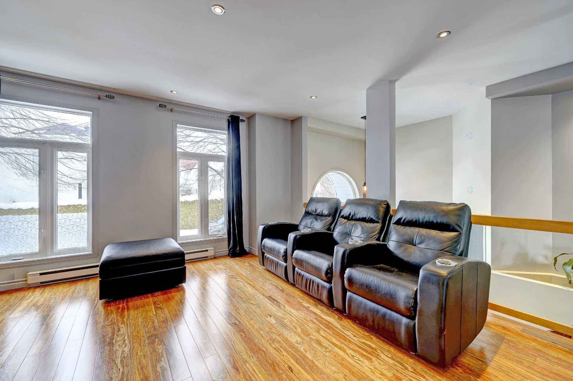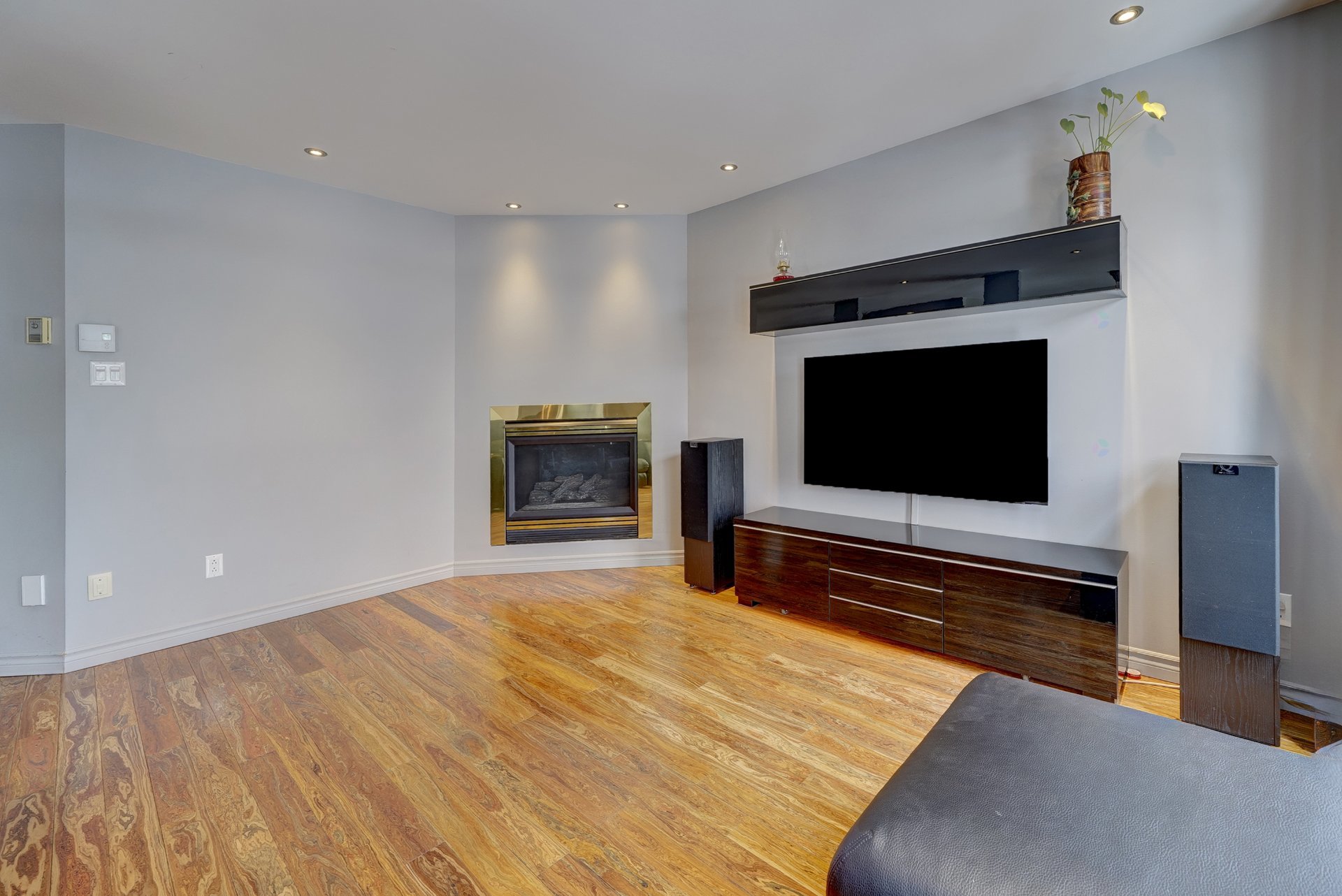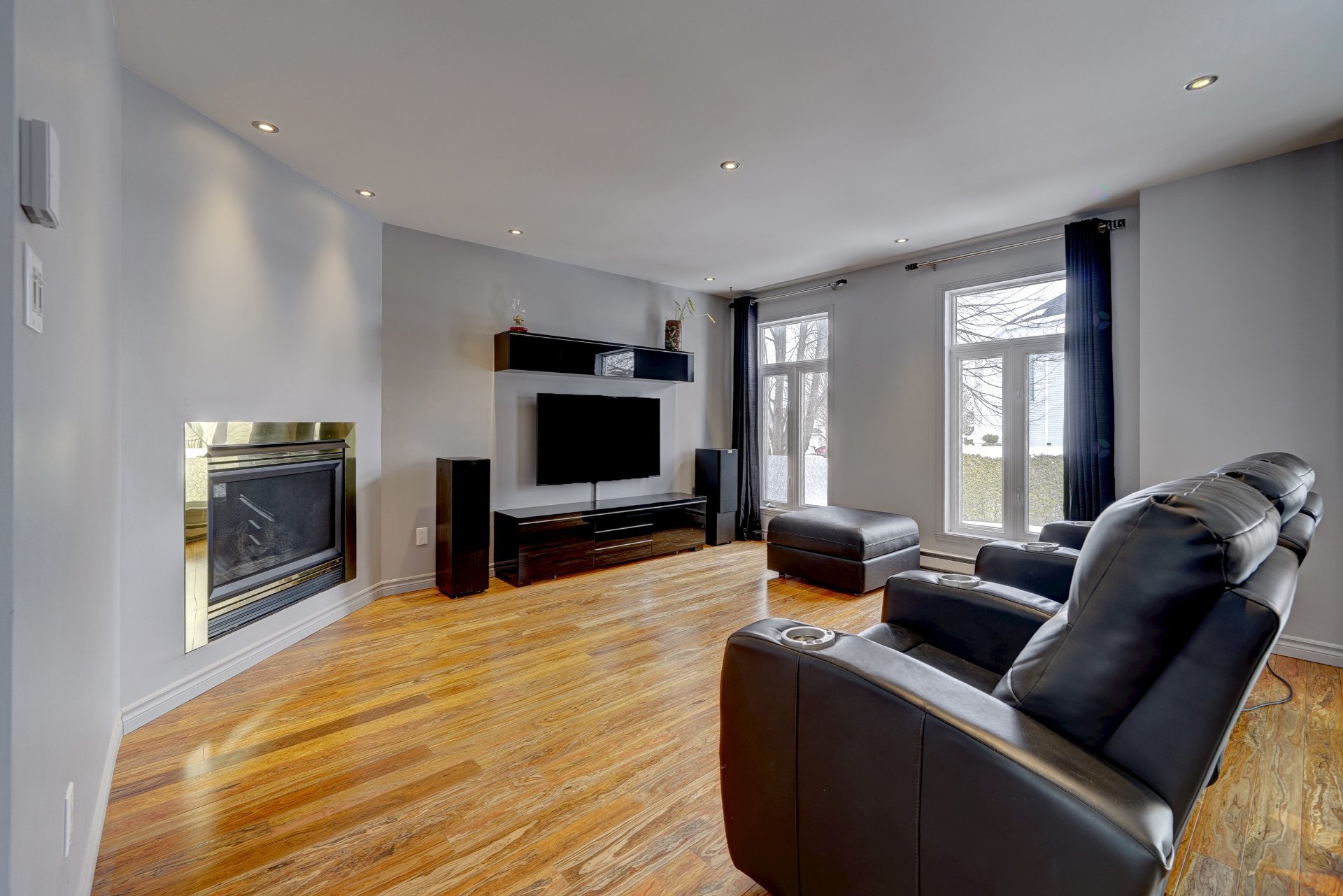 -Salon avec planchers en lattes de bois exotique et foyer au propane